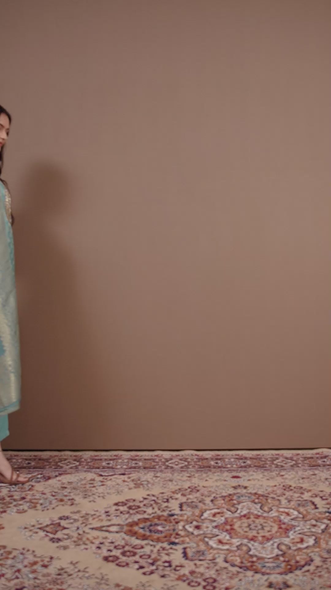 This elegant blue pure Banarasi straight suit features intricate handwork that adds a touch of opulence. Complemented by matching pants, it is beautifully paired with a luxurious Banarasi dupatta that enhances its regal charm. Perfect for special occasions, this ensemble embodies timeless sophistication and craftsmanship.