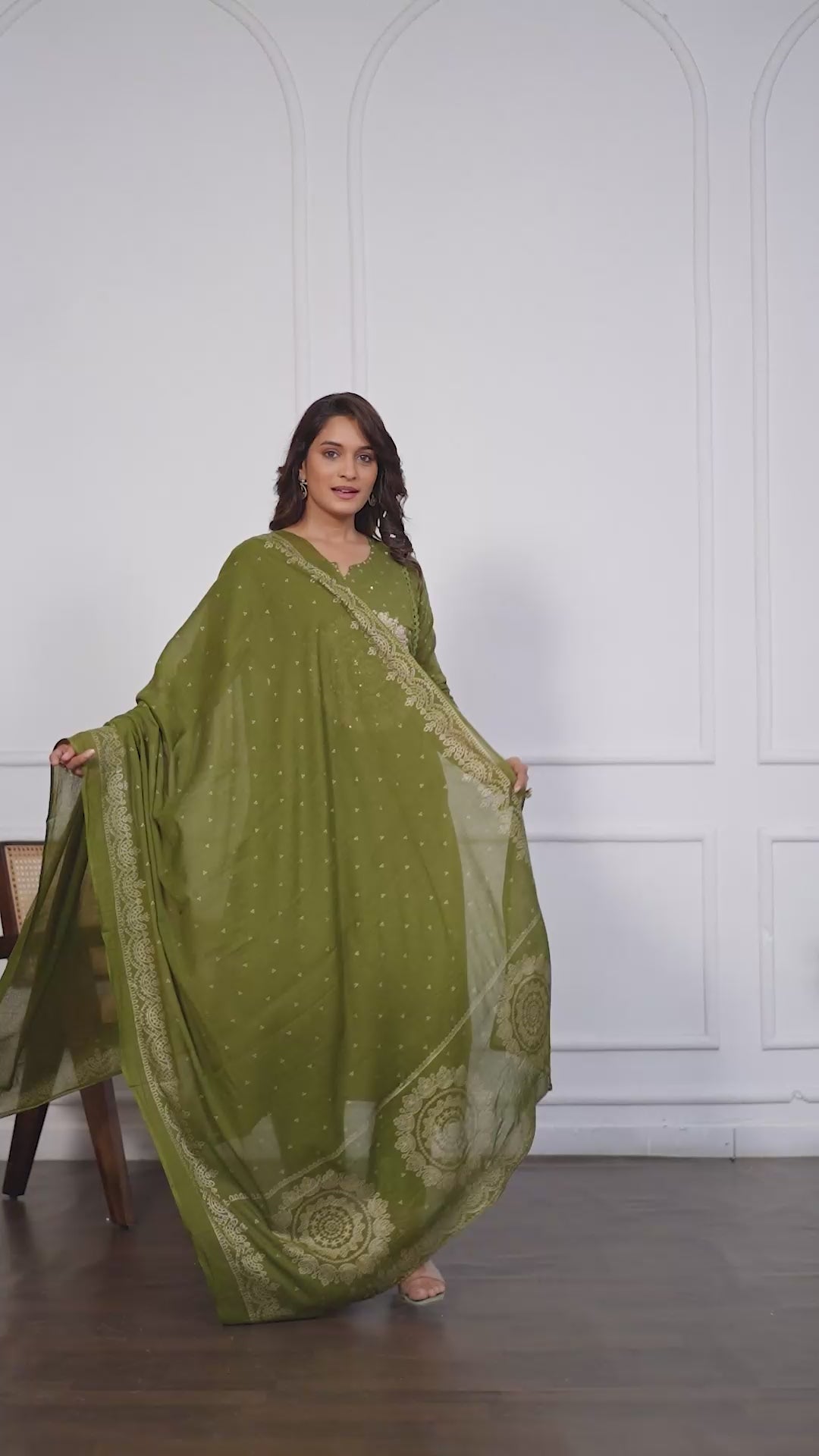 VARAMYA Olive Green Cotton Embroidered Suit Set with Dupatta