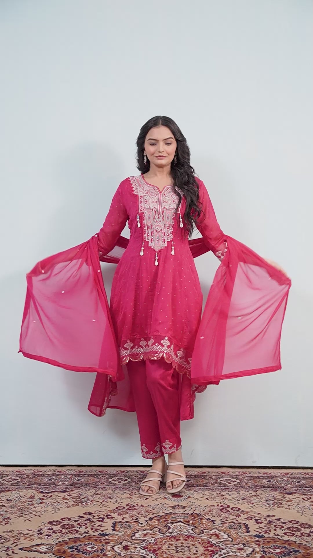 This charming pink up-down ethnic Anarkali suit features exquisite scalloping work along the work on neck and sleeves, adding a delicate touch to its silhouette. The design is complemented by elegant pants and silhouette is creating a graceful flow. Finished with a lightweight Nazmin dupatta, this ensemble is perfect for festive celebrations and special occasions.