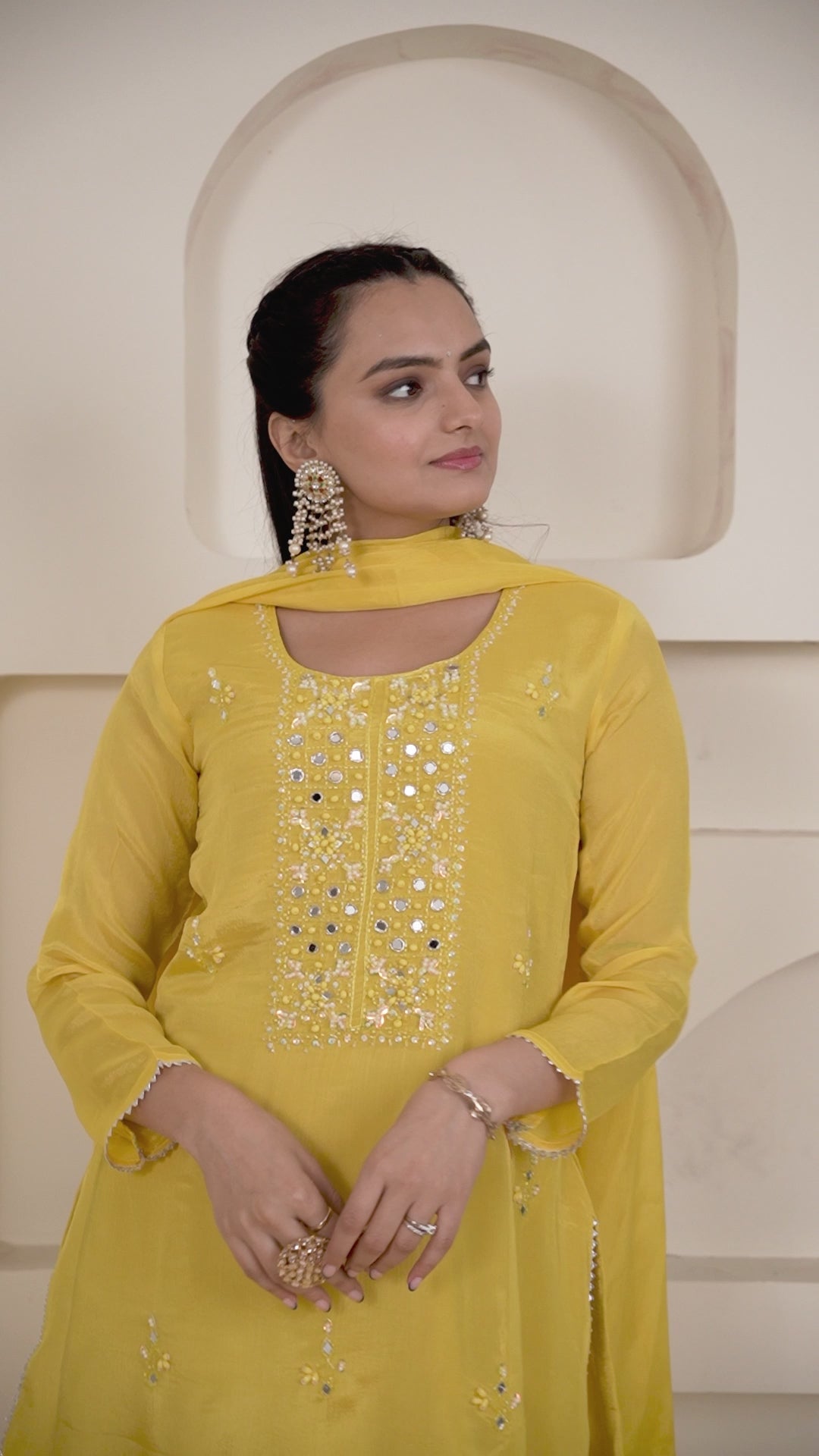 This Yellow Hand and Pearls Work Sharara Suit Set exudes elegance with its intricate craftsmanship. The chiffon kurta is beautifully adorned with delicate handwork, featuring pearls and mirror embellishments that add a touch of glamour and sophistication. The sharara is designed with a flattering gathered style, offering a voluminous and graceful silhouette. The fabric drapes effortlessly, giving a soft and airy feel. The set includes a matching dupatta, which complements the kurta and sharara, creating a harmonious look. Ideal for weddings, festive events, or special occasions, this ensemble is perfect for making a statement. The combination of traditional design and modern elements makes this outfit a timeless addition to your wardrobe.